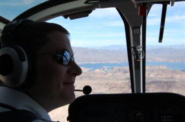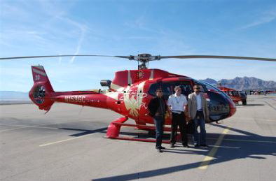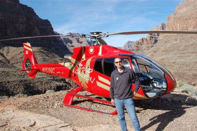 Das Wetter ist perfekt ! Wir werden von einem kleinen Bus am Hotel abgeholt und nach Boulder gefahren. Der Busfahrer ist unheimlich freundlich und erklärt uns was wir rechts und links des Highways alles sehen. In Boulder ist ein kleiner Flughafen, von wo aus verschiedene Rundflüge angeboten werden. Wir haben übver SmarterVegas einen mit Landung am West Rim Grand Canyon und Champanger Lunch gebucht. Nach den Sicherheitsmaßnahmen werden wir von unserem Piloten aufgerufen. Es wird noch ein Foto gemacht mit Mensch und Maschine (wir kaufen das nachher, obwohl wir das sonst nie machen. Es ist einfach zu schön). Mit uns fliegen 3 chinesische Geschäftsleute und ihr Übersetzer.