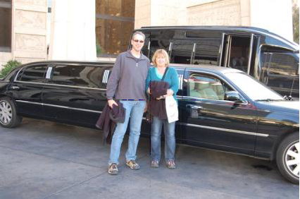 Leider sind wir bald wieder am Flughafen. Mit dem Bus fahren wir zurück nach Las Vegas. Diesmal mit Mr. Grumpy persönlich. Am Luxor hält er an und gibt uns ein Zeichen, daß wir aussteigen können. Ich habe nichts gegen einen Fußmarsch, aber wir hatten mit Rückreise gebucht. Draußen steht eine Frohnatur im schwarzen Anzug. Etwas weiter eine Stretchlimosine und ein Kleinbus. Grinsend sagt er uns, wir fahren das letzte Stück mit der Limo, nimmt uns unseren Fotoapperat ab und schiebt uns zum Auto. Wir denken immer noch, der veräppelt uns, wir fahren sicher mit dem Bus. Er macht die Bilder, öffnet die Tür und läßt uns einsteigen. Super ! Es kommt noch eine indische Familie dazu, dann fahren wir zum Hotel. Wir kommen uns vor wie in einem Tausendfüßler.