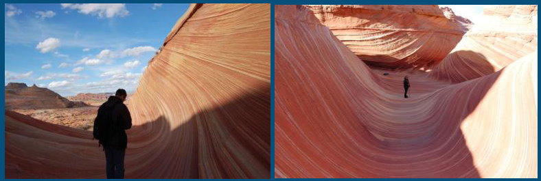 Nach einer Weile gehen wir zurück zur ersten Wave. Wir gehen jetzt runter in die Welle hinein und sehen nun das ganze Ausmaß. Gigantisch ! Wir sind beeindruckt. Ein älteres Ehepaar ist auch dort. Es ist ihr dritter Anlauf hierher zu kommen. Immer war das Wetter schlecht. Was haben wir ein Glück, daß es heute so schön sonnig ist und mit ca. 15°-17°C wohltemperiert. Wir fotografieren uns gegenseitig.