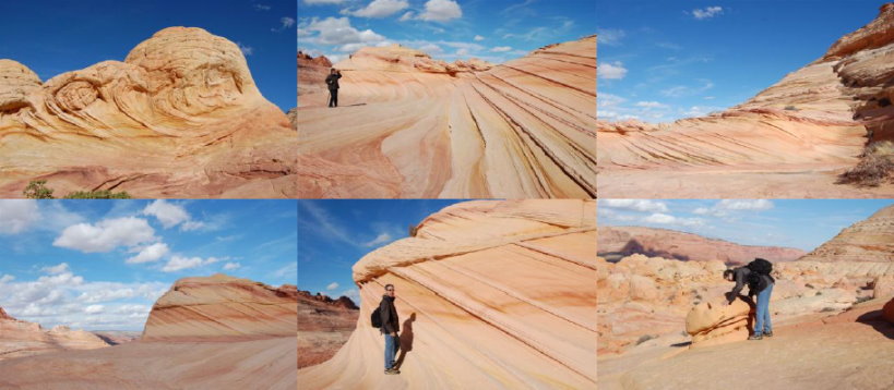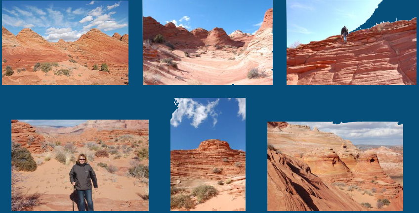 Auf allen Vieren krieche ich Berge hoch, habe das Gefühl am Ende meiner Kräfte zu sein. Was mache ich hier ? Erny hat eine erstaunlich gute Kondition, die Kraft über mich zu lachen und zieht mich an meinem Wanderstock nach oben. Aber ich will unbedingt da hin ! Nach 2 Stunden kommen wir zur Wave. Von oben, weil wir irgendwo falsch gelaufen sind. Wir machen eine Pause, Erny muß etwas essen. Wir sitzen da auf den Steinen, ich schaue runter zur Wave und denke, naja, schön, aber warum machen da alle so ein Wind drum. Später erst kommt unsere Begeisterung auf.
